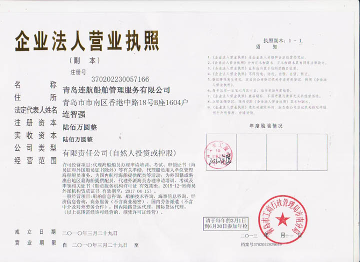 2012年04月青島連航船舶管理服務(wù)有限公司取得《海員外派機(jī)構(gòu)資質(zhì)證書》,為海洋船舶提供配員,代理船員用人單位管理海洋船舶船員事物,代理海洋船舶船員申請(qǐng)培訓(xùn)、考試、申請(qǐng)證書等業(yè)務(wù)。